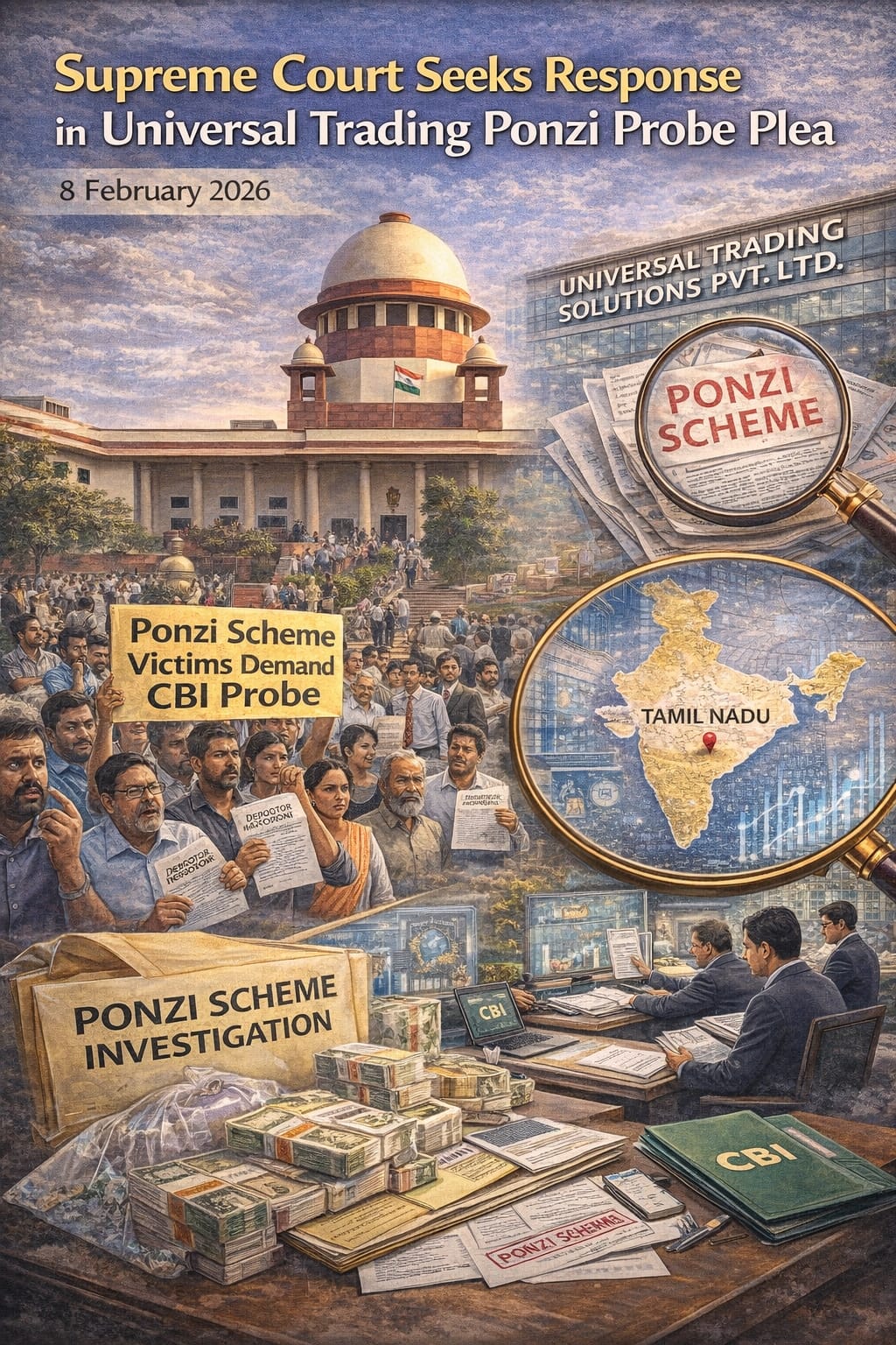 The Supreme Court of India on 8 February 2026 sought a formal response from the Government of India and the Government of Tamil Nadu in a petition demanding a CBI probe into an alleged Ponzi scheme run by Universal Trading Solutions Private Limited. The plea was filed by depositors in Coimbatore, Tamil Nadu, who claimed massive financial loss due to the scheme.