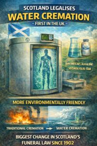 Scotland has become the first nation in the United Kingdom to legalise water cremation, also called alkaline hydrolysis. The process uses water, heat, and potassium hydroxide to accelerate natural decomposition. It operates at around 150°C for about 90 minutes. Supporters say the method is more environmentally friendly than traditional cremation because it produces fewer emissions. The reform represents Scotland’s biggest change in funeral legislation since 1902.