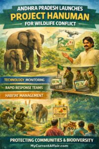 Andhra Pradesh Deputy Chief Minister Pawan Kalyan launched Project HANUMAN to reduce human-wildlife conflict. The initiative focuses on technology-based monitoring, rapid response teams, and habitat management. Increasing encounters with elephants and other wildlife have raised concerns in several districts. Therefore, authorities aim to protect both communities and animals. The project also promotes scientific conservation practices and early warning systems to prevent clashes and safeguard biodiversity.