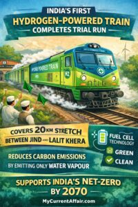 India successfully conducted a trial run of its first hydrogen-powered train in Haryana. The train covered a 20-km stretch between Jind and Lalit Khera at around 70 kmph. Hydrogen trains produce electricity through fuel cells, emitting only water vapour. Therefore, they significantly reduce carbon emissions. Indian Railways plans to deploy such trains on heritage and narrow-gauge routes. This initiative aligns with India’s goal of achieving net-zero carbon emissions by 2070.