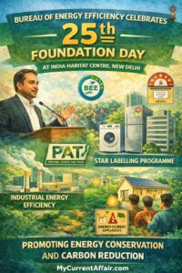 The Bureau of Energy Efficiency (BEE) celebrated its 25th Foundation Day at the India Habitat Centre, New Delhi. BEE operates under the Ministry of Power and promotes energy conservation policies across India. The event highlighted major initiatives like PAT (Perform, Achieve and Trade) and the Star Labelling Programme. These programmes encourage industries and consumers to adopt energy-efficient technologies. Consequently, they contribute to reducing energy demand and lowering carbon emissions.