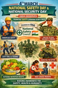 India observes National Safety Day on 4 March to promote workplace safety and accident prevention. The day also marks National Security Day, honouring the role of security forces in protecting the nation. The observance commemorates the foundation of the National Safety Council in 1966. Various organisations conduct awareness drives, safety drills, and training programmes. Meanwhile, the day also coincides with National Nutrition Month and Red Cross Month, encouraging public health and humanitarian awareness.