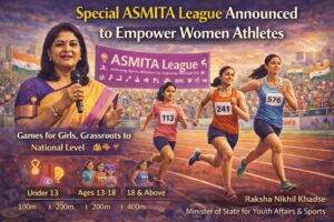 Minister of State for Youth Affairs and Sports Raksha Nikhil Khadse has announced a special edition of the ASMITA (Achieving Sports Milestone by Inspiring Women Through Action) League in New Delhi to mark International Women’s Day on March 8. The initiative aims to empower female athletes by providing grassroots-level competitive opportunities. The league aligns with the vision of strengthening sports culture nationwide. Competitions will be held in three age categories—Under 13, 13–18 years, and 18 years and above—with athletics events including 100m, 200m, and 400m races.