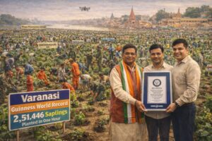 Uttar Pradesh’s Varanasi set a new Guinness World Record during a ‘Mega Plantation Drive’ in the Sujabad Domari area by planting 2,51,446 saplings in just one hour, surpassing China’s 2018 record of 1,53,981 saplings. The certificate was presented by Guinness judge Rishinath after verification using drone cameras and digital counting systems. The urban forest is uniquely divided into 60 sectors named after Kashi’s famous ghats, aiming to create a ‘Mini Kashi’ riverside. With 27 native, fruit-bearing, and medicinal species planted, the drive saw participation from the Indian Army, NDRF, CRPF, government departments, and thousands of students and volunteers.