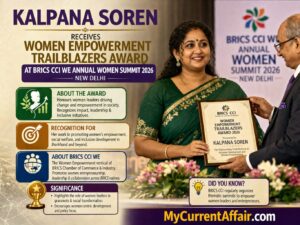 Kalpana Soren received the Women Empowerment Trailblazers Award at the BRICS CCI WE Annual Women Summit in New Delhi. The honour recognised her work in inclusive development and women-centred social initiatives. Moreover, the award was presented under the BRICS Chamber of Commerce and Industry platform, which supports women entrepreneurship and leadership. Therefore, the recognition carries significance in social policy discourse. For exams, note that BRICS CCI often hosts thematic leadership summits linked to women-led development.