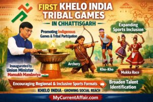 The first Khelo India Tribal Games started in Chhattisgarh and were inaugurated in Raipur by Union Minister Mansukh Mandaviya. Moreover, the event promotes indigenous games, tribal participation, and sports inclusion. Therefore, it expands the social reach of the Khelo India programme. For exams, remember that Khelo India has increasingly added regional and inclusive sporting formats to broaden talent identification.