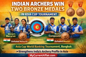 India won two bronze medals at the Asia Cup World Ranking Tournament in Bangkok. In women’s recurve, Ruma Biswas, Kirti, and Riddhi Phor defeated Malaysia, while in men’s compound Rajat Chauhan, Rishabh Yadav, and Uday Kamboj defeated Bhutan. Moreover, both results add ranking value for future international qualification. Therefore, the event strengthens India’s archery profile in Asia. For exams, note that recurve archery is the Olympic discipline, whereas compound archery is widely contested internationally but not yet Olympic.