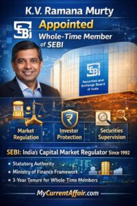 The Government appointed Kompella Venkata Ramana Murty as a whole-time member of Securities and Exchange Board of India for three years. Moreover, whole-time members play a major role in market regulation, investor protection, and securities supervision. Therefore, the appointment is important for financial governance. For exams, remember that SEBI is India’s statutory capital market regulator established in 1992 and functions under the Ministry of Finance framework.