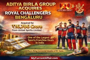 A consortium led by Aditya Birla Group acquired 100% equity in Royal Challengers Bengaluru for ₹16,706 crore from United Spirits Limited. Moreover, this became one of the largest sports franchise transactions in India. Therefore, the deal reflects rising commercial valuation of IPL teams. For exams, remember that sports franchise valuation increasingly reflects media rights, sponsorship, and fan base economics.