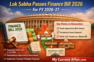 Lok Sabha passed the Finance Bill 2026 by voice vote, giving legal effect to the Union Government’s taxation and financial proposals for FY 2026–27. Moreover, the House approved amendments moved by the government before final passage. Therefore, the bill completes a major part of annual budget legislation after the Appropriation process. For exams, note that Finance Bill contains taxation changes and becomes law only after approval by both Houses and Presidential assent under Article 110 when treated as a Money Bill.