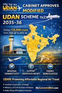 The Union Cabinet approved Modified UDAN for ten years from 2026–27 to 2035–36 with an outlay of ₹28,840 crore. Moreover, the scheme aims to improve regional air connectivity by supporting underserved and remote airports. Therefore, UDAN remains central to India’s aviation expansion strategy. For examinations, note that UDAN stands for Ude Desh ka Aam Nagrik and operates under the Ministry of Civil Aviation to make flying affordable and geographically inclusive.