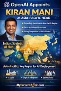 OpenAI appointed Kiran Mani as Asia-Pacific head to expand operations across high-growth markets including India. Moreover, the appointment reflects growing competition among global AI firms in Asia’s digital economy. Therefore, India’s AI ecosystem gains strategic relevance in global technology expansion. For exams, note that Asia-Pacific has emerged as a key region for AI deployment because of scale, digital adoption, and talent availability.