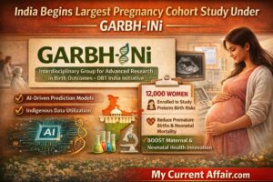 Department of Biotechnology launched India’s largest pregnancy cohort study under GARBH-INi, enrolling around 12,000 women to study preterm birth risks. Moreover, the programme uses indigenous data and AI-based prediction models to reduce neonatal mortality. Therefore, the initiative is significant because India carries a major global burden of premature births. For exams, remember that GARBH-INi stands for interdisciplinary pregnancy research aimed at maternal and neonatal health innovation under India’s biotechnology mission.