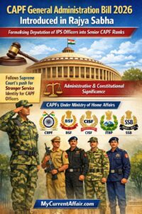 Rajya Sabha saw introduction of the Central Armed Police Forces (General Administration) Bill, 2026, which seeks to formalise deputation of IPS officers into senior CAPF ranks. Moreover, the bill gained attention because it follows a Supreme Court observation favouring stronger service identity for CAPF cadre officers. Therefore, the issue has administrative and constitutional significance. For exams, note that CAPFs include CRPF, BSF, CISF, ITBP, and SSB under the Ministry of Home Affairs.